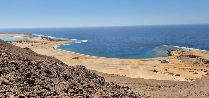 Чтобы проникнуться духом будущего, решено остановиться неподалеку от гигантской строительной площадки The Line. Там есть красивая лагуна с великолепной бирюзового цвета водой и романтичным названием "Пляж влюбленных":