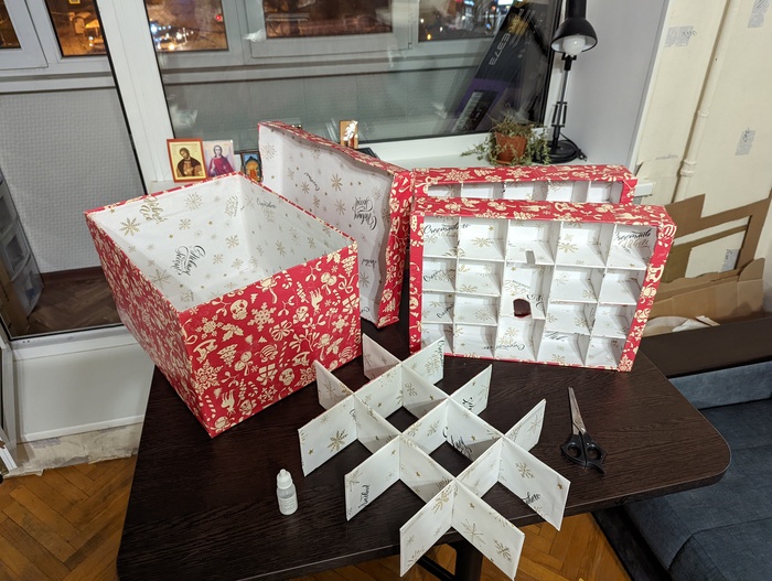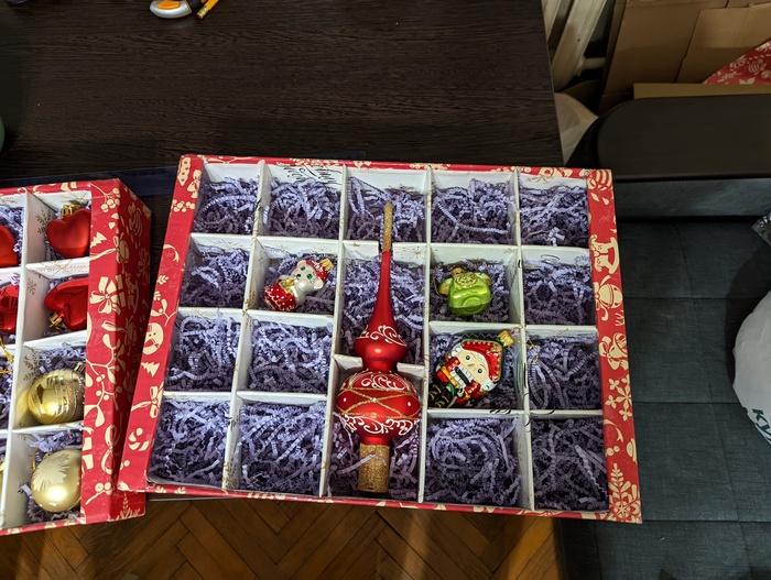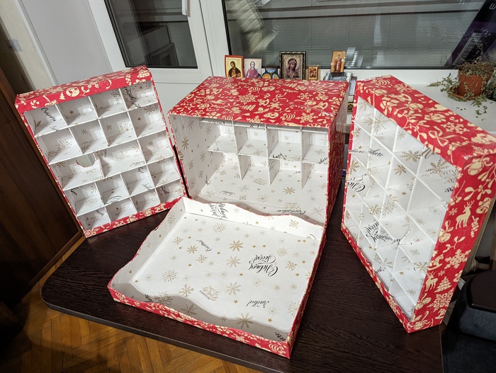 Наконец-таки доделал коробку для новогодних игрушек! Начал ещё в январе, делал по вечерам после работы. Итого: ушло 9 рулонов упаковочной бумаги, 5 рулонов двустороннего скотча, 1 рулон обычного скотча, тюбик клея, 2 больших коробки картонных из Максидома, 1 полотно для ножа и 15 фильмов. Жена не ушла) На дворе уже апрель, и новый год вроде как прошел, ну и ладно...