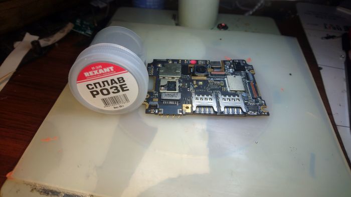 С помощью сплава РОЗЕ, пропаяем "новый" разъем прям на потрАшках донора. Это нам нужно для того, чтобы снизить температуру плавления припоя.