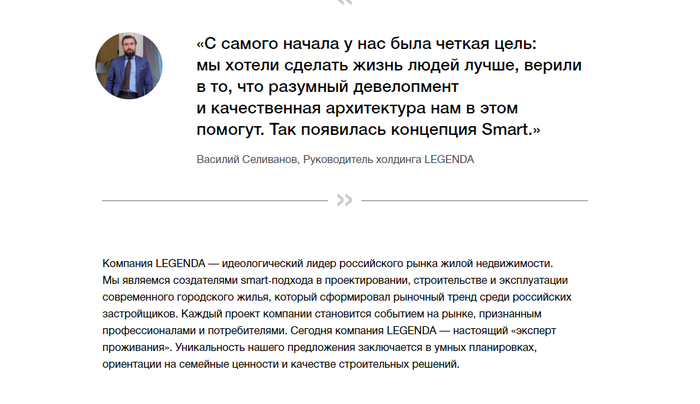 Мой друг купил у Легендарных квартиру, стоимостью выше рынка (8.5 млн. за 60 метров) еще на стадии строительства. Выше рынка взял, так как обещали закрытый супердвор без машин, охрану ЧОПовцев, смарт-системы в доме и непревзойденной качество, ну и дом, сданный раньше срока ДДУ.