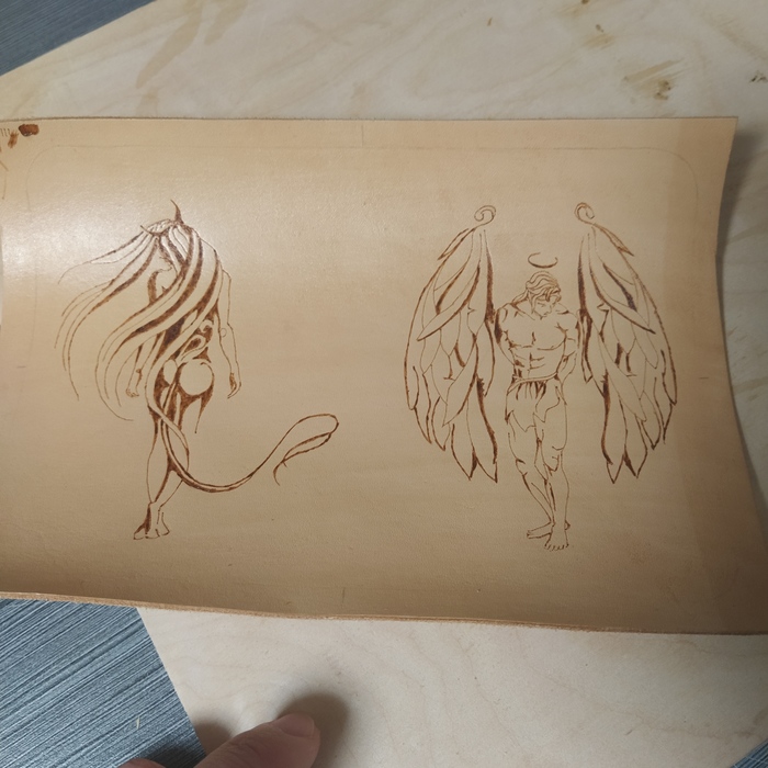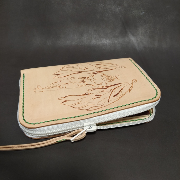 Кошелек из кожи (растишка 1.5-2мм), старался сделать максимально миниатюрным для размещения паспорта, рисунок сделан выжигателем, нить плетёная 0.8 (цвет пожелал заказчик). Сильно не ругайте, только учусь, но всегда рад конструктивной критике).