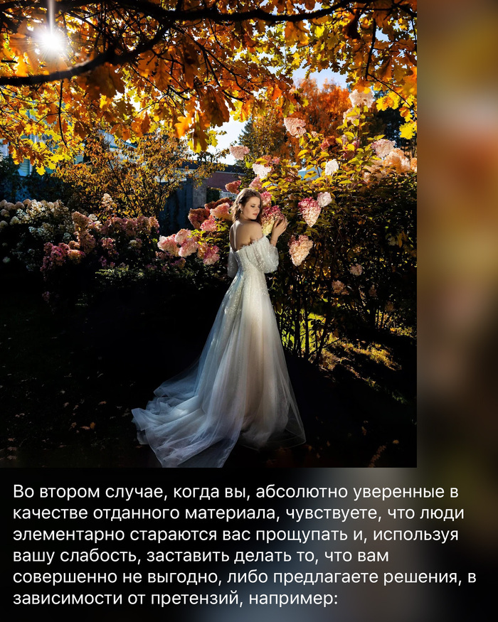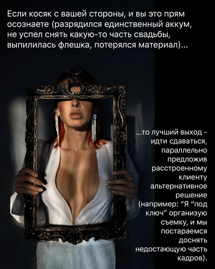 И, вот, как по мне, если в личном творческом проекте, когда ты сам себе режиссер, это приемлемо, то на коммерческих или имиджевых съемках, кроме того, что ты добровольно отказываешься от гонорара только потому, что чего-то не знаешь, это ещё и явный признак непрофессионализма.
