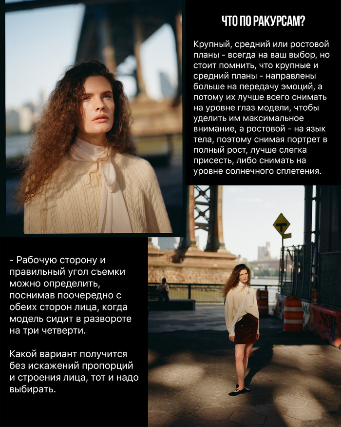 Камеру располагаем чуть выше глаз модели. Такой угол съемки позволит подчеркнуть черты лица и сделать все линии тела стройнее. Заодно избежите проблемы двойного подбородка.