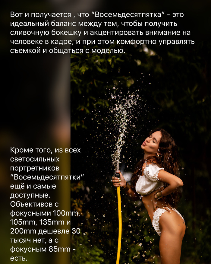 Знаю популярную теорию, что в этом случае, наоборот, лучше выбрать объектив с фокусным пошире, но тут велик риск получить обратный эффект, “растянув” фигуру модели ещё сильнее, благодаря оптическим искажениям.