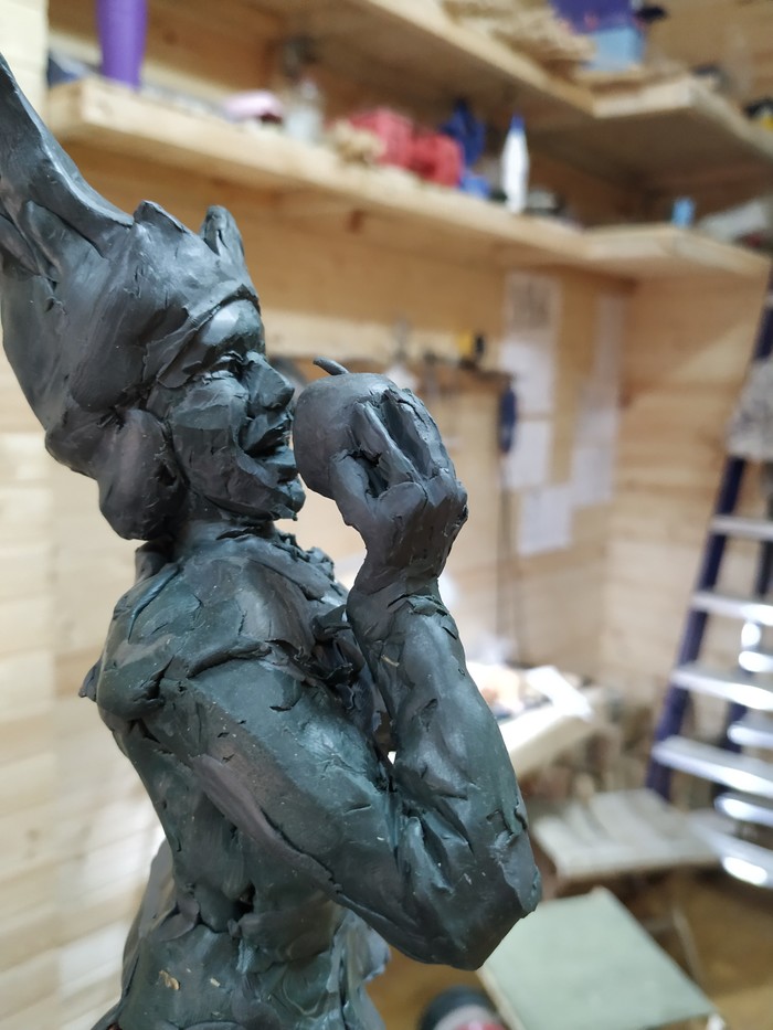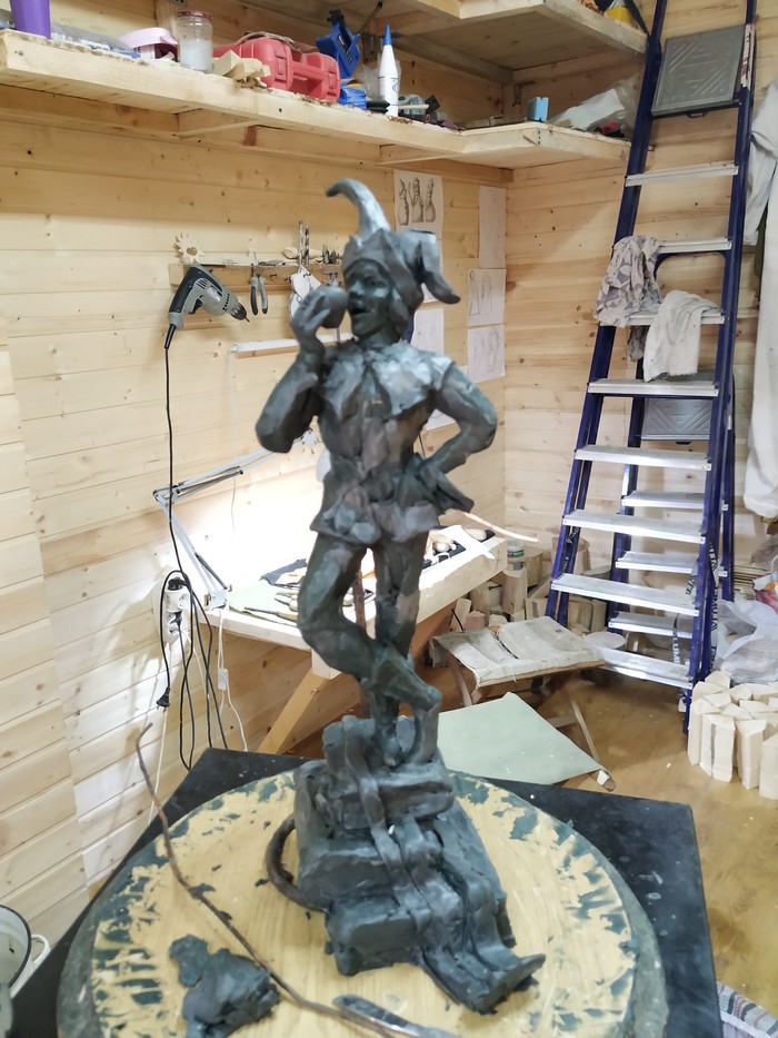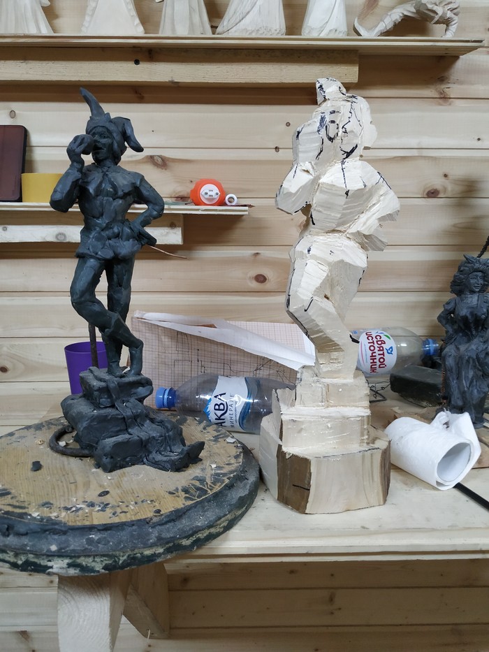 Много фигурная композиции под названием "живи здесь и сейчас" выполнена из древесины липы, с применением богородских приёмов разных веков. За основу взят скоморох как ярчайший образ русской импровизации. Именно его образ призывает нас жить в моменте;)… если будет интересно я могу конкретнее рассказать про каждого из трёх скоморохов и кота с собакой