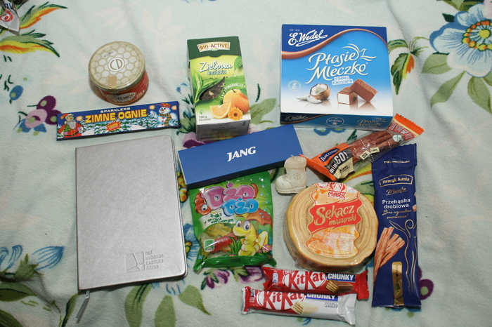 А в целом - замечательный вкусный подарок, с бонусом в виде блокнота, ручки, бенгальских огней, и свечки-сапога. Забавно на продуктах читать вполне узнаваемые слова и фразы: например, "KABANOS mini" на колбасках, или "Ptasie Mleczko" =)