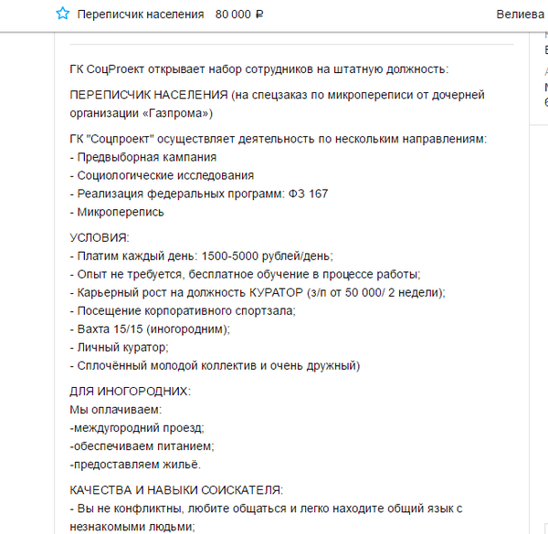 Вакансия: Переписчик населения. З/П : ОТ 80000 руб.