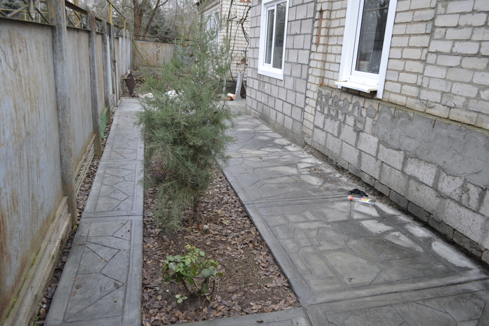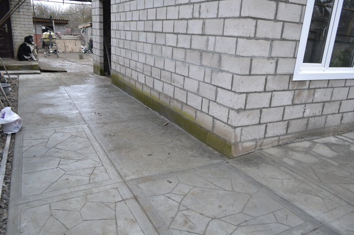 Толщина плиты варьируется от 5 см до 10 см. Арматурную сетку не закладывал, возможно это и не правильно, но это дополнительные затраты а бетонировал я по старому основанию, которое имеет тоже не малую толщину. Подстраховался путем расшивки на сегменты, есть надежда что если лопнет то лопнет по шву. Прошу Вас не закидывать тапками, да может и не по технологии но меня в полне устраивает. Как только потеплеет буду красить. Если найду кислоту буду красить ей, если нет то попробую колером на грунтовке.