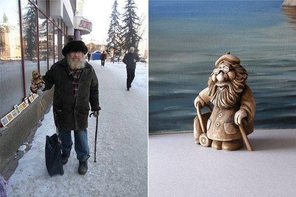 Вместе с другими художниками отец продавал свои работы у "Салона художников" и на бульваре Гагарина в г. Иркутске. Там же - на месте в свободное, так сказать, время резал скульптуры. Ниже на фото один из художников Иркутска - Станислав Иванович (оригинал и маленькая копия, сделанная моим отцом).