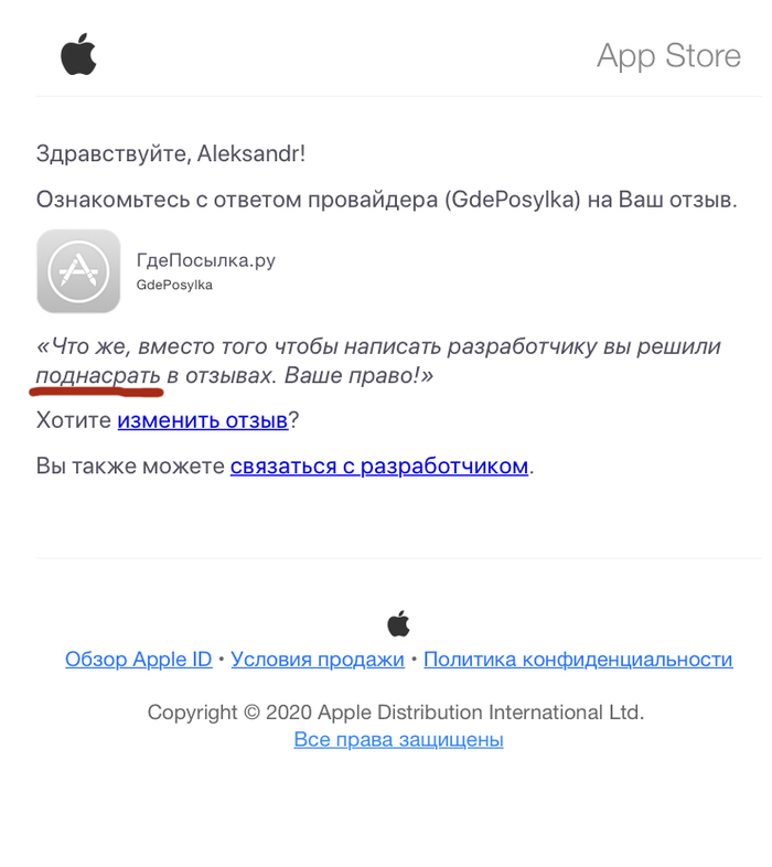 пользуюсь всеми известной программой : где посылка. В последнем обновлении была ошибка, на что я написал отзыв: отличное приложение, но пжл исправьте вот этот баг и ставлю одну звезду. На что получил ответ , на картинке.