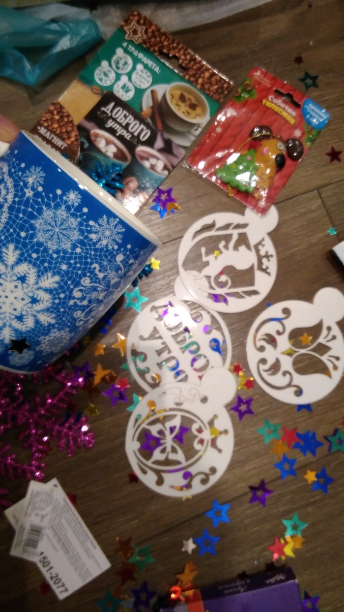 У меня теперь есть блестяшки для елки (буду радоваться и на следующий новый год) и повод для творчества - трафареты. Стану бариста ) И кружка, как раз к гостям )