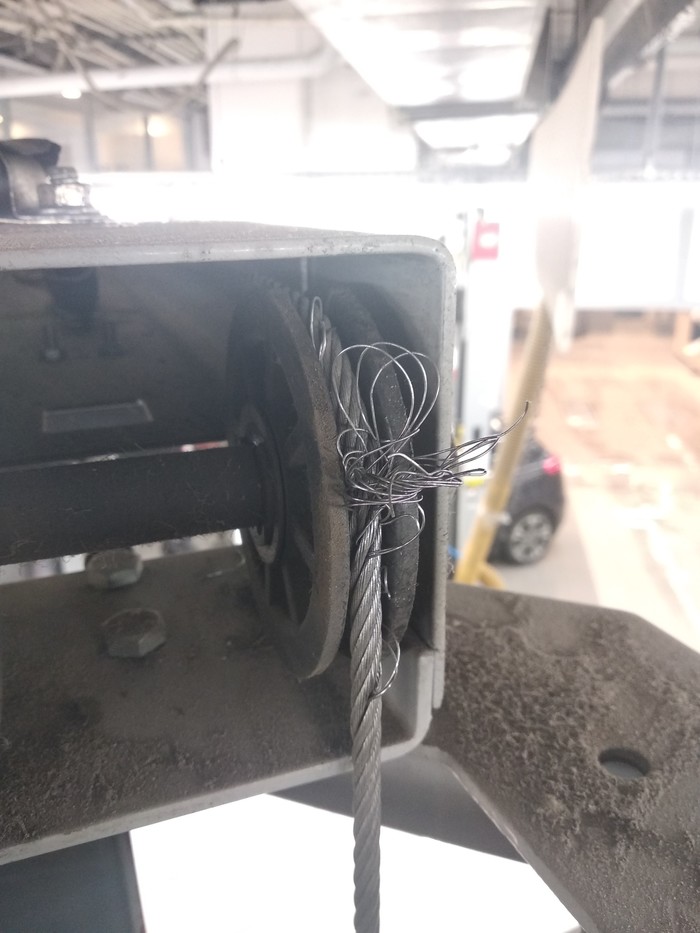 Это трос синхронизации. Второй примерно в таком же состоянии. Тут однозначно - замена. Вешаю на подъёмник табличку "Работать запрещено", и собираюсь ехать за тросами. Сука, только переоделся, вхожу в цех - блять! На этом подъёмнике уже машина висит! Я к мастеру, мол, ты чего, хочешь несчастный случай на производстве? Мастеру, оказывается, похуй, у него запись на этот подъёмник на весь день.