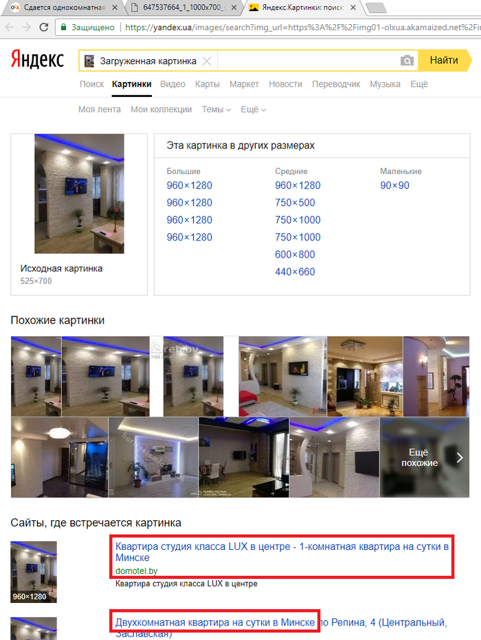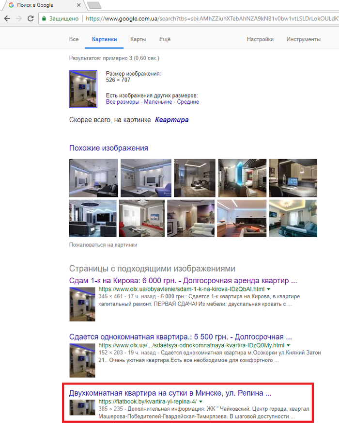 Если фото будет найдено в объявлениях вида «Квартира на сутки в Минске», то вас должен насторожить даже не срок аренды, а то, что квартира в другом городе (и стране) сдаётся с точно такими же фото. А, значит, этим объявлению и автору нельзя доверять. Настоящий арендодатель сделал бы фото, даже если не успел бы убрать в квартире, или указал бы, что фото будут позже – а не воровал бы чужие фото из других городов, выдавая их за свои.