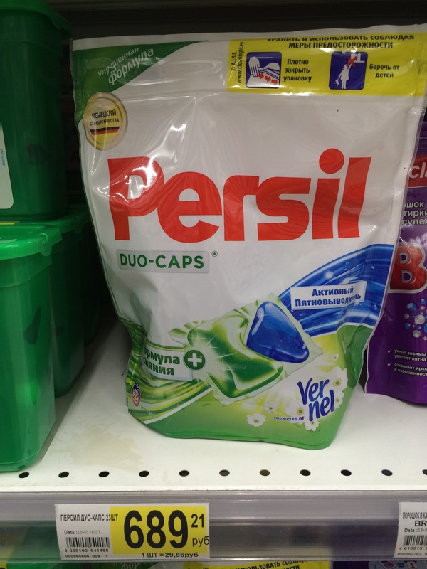 Выбирал сегодня в Ашане стиральный порошок в капсулах. Поскольку один раз персил - всегда персил, он меня и заинтересовал.