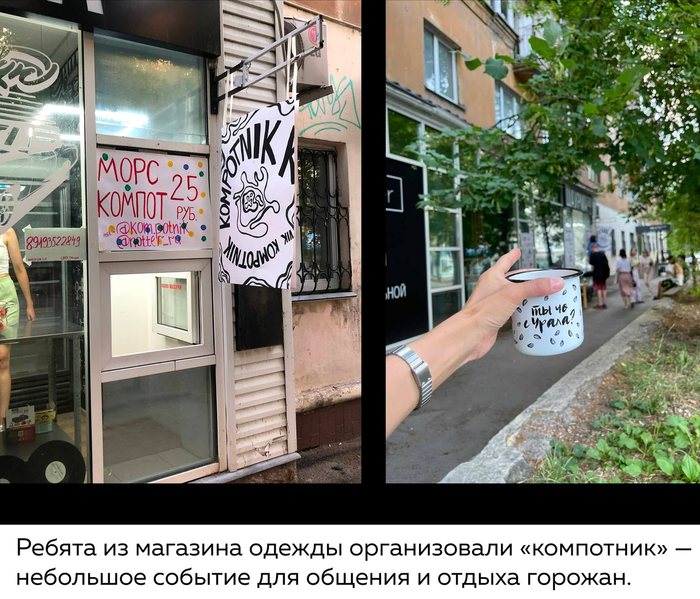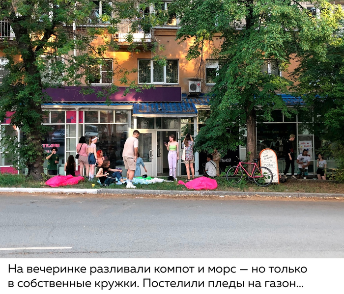 Вчера вечером ребята из магазина одежды организовали встречу для горожан. Попить прохладных компотов с морсом и пообщаться. Они ещё не знали, что допустили ошибку — арендовали помещение напротив здания МВД на улице Васенко. В центре Челябинске, в том же доме, где мы отремонтировали вывеску шахматной школы.