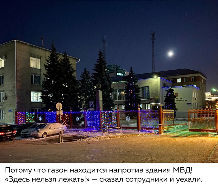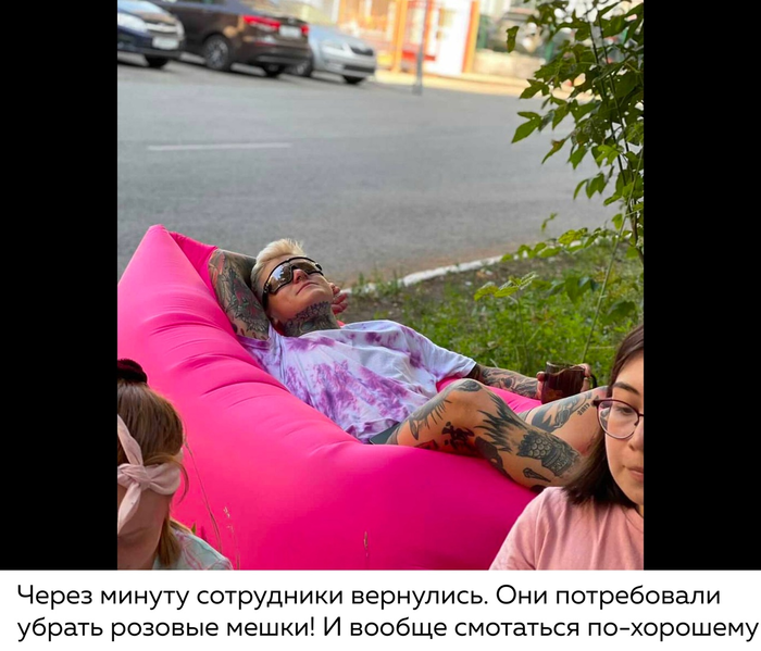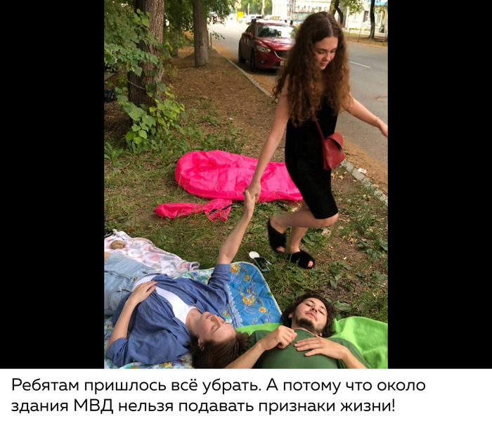 Короче, подъехали сотрудники, потребовали убрать пледы, розовые мешки и вообще не отсвечивать. Потому что «нельзя лежать на траве напротив здания МВД»!