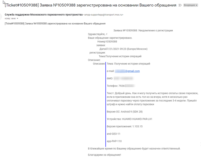 Уъуъуъ, сильно негодую, так как всегда плачу за парковку, тем более цена 40р в час там. Далее, как добросовестный плательщик за парковки думаю "может что-то пошло не так и это ошибка" лезу в приложение парковки Москвы с целью посмотреть историю парковок и проверить что все оплачено. И тут ждет первый сюрприз - история есть только за вчерашнюю парковку, как будто я раньше никогда ничего не оплачивал. Думаю может сбой базы какой у них, вижу в меню пункт "обратная связь" и там есть тип обращения "Получении истории операций". Ок, нам не сложно, напишем мол "так и так, смотрю пусто, дайте историю парковочных сессий", на что приложение рапортует "ответ получите на свою почту ****@Gmail.com". И правда, пришло письмо о номере заявки: