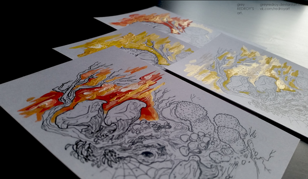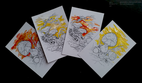 Размер 140х95 mm (почтовая открытка), цветной фон нарисован на каждом экземпляре отдельно (акрил). Т.к. я использовала золотой и серебряный акрил, то открытки красиво блестят на свету... и, конечно, в реальности это выглядит намного круче, чем на убогой телефонной фотке, но уж как есть =_=
