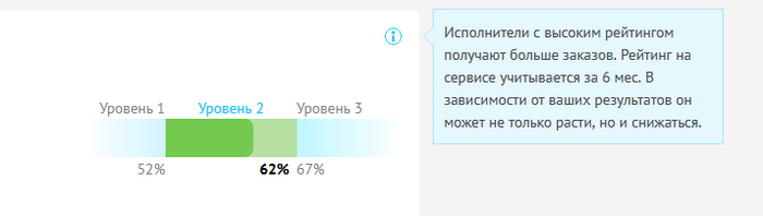 Но и этого мало - у каждого пользователя в профиле есть система уровней - в которых пользователь растёт по мере выполнения заказов. И только крутыши получают лучшее!