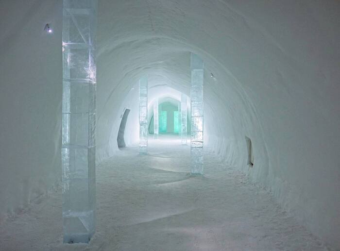 От ледяного стола к номерам ледяного отеля тянется коридор. Пройдя по нему, вы увидите новый мир.