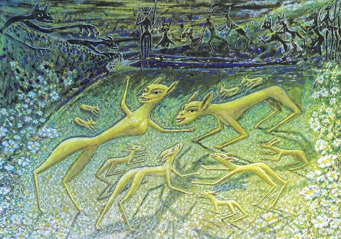 Наташа при обследовании была растеряна, что-то отгоняла от себя, просила освободить ее от «плохой» девочки. Рассказывала о «невидимках», настолько маленьких, что увидеть их может только внимательный человек или через микроскоп. Раздражалась, когда ее невнимательно слушали. И охотно комментировала свое творчество. На всех рисунках изображала исключительно «невидимок»: «Невидимки уезжают на дачу», «Бал у невидимок», «Невидимки идут на работу».