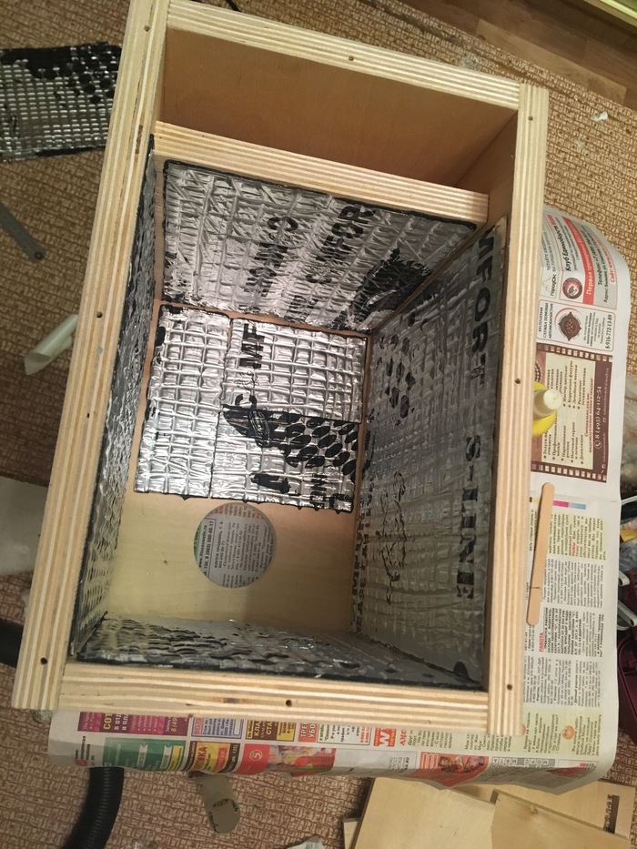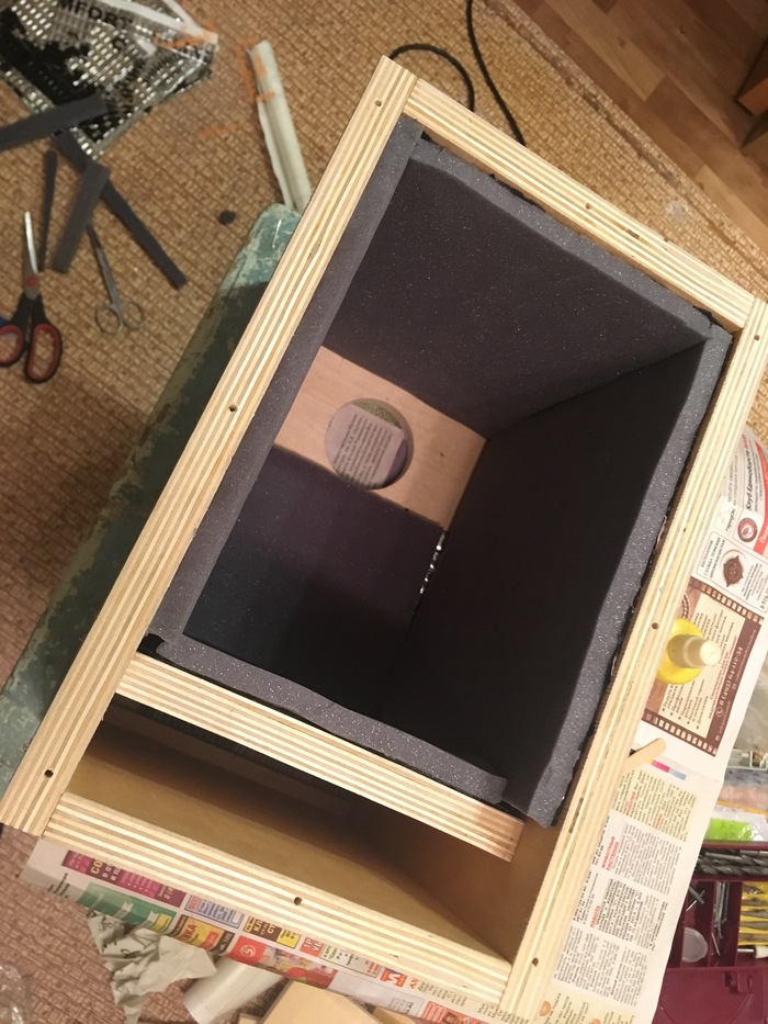 Сначала скрутл колонку без передней части. Собирал на шурупах 30мм и все стыки промазывал ПВА. Сначала опасался, что ПВА не даст нужного результата, но в дальнейшем понял, что он намертво склеивает фанеру. Далее вибро и шумоизоляция. Все из обычных автомагазинов.