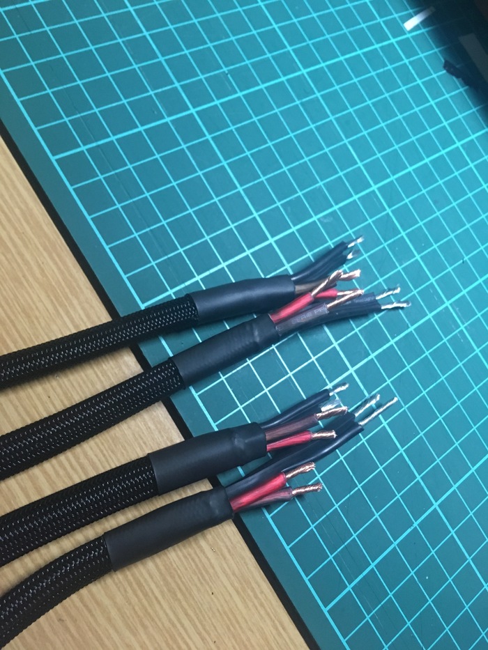 С проводами нужно было что-то сделать, так как две пары до каждой колонки не очень удобно раскладывать. да и выглядит сомнительно. Закупил "змеиную кожу" и термоусадку, стер за пару вечеров руки натягивая оплетку на провода, и вот- все готово. Соответствует цветовой схеме колонок.