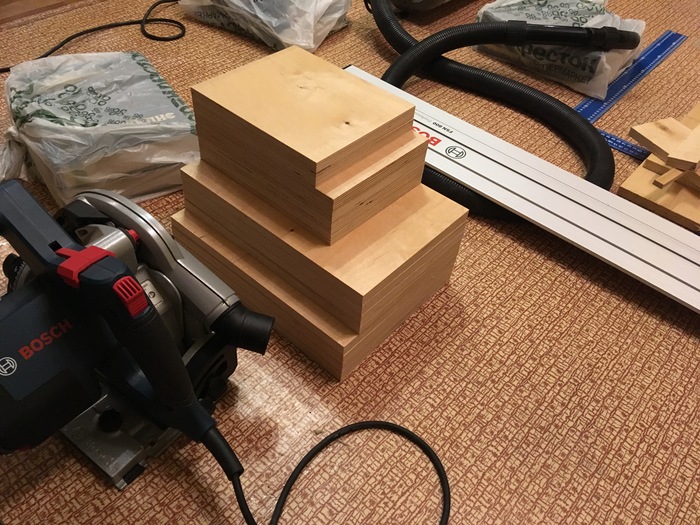 Распилил половину листа на кучу прямоугольников. В процессе старался максимально точно выставлять направляющую, чтобы прямоугольники были прямоугольниками, а не параллелограммами или трапециями.