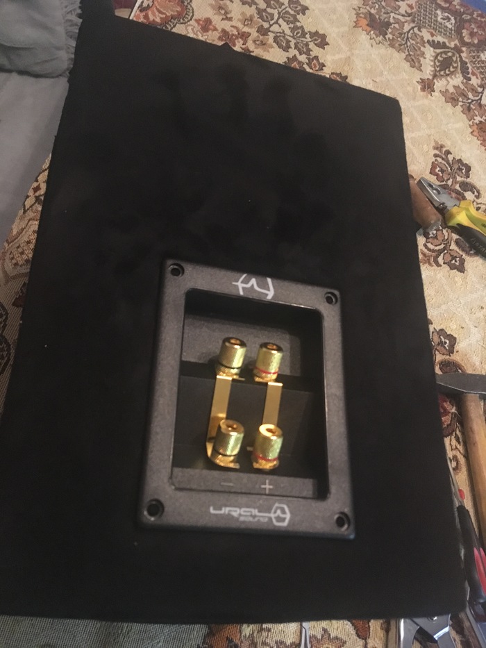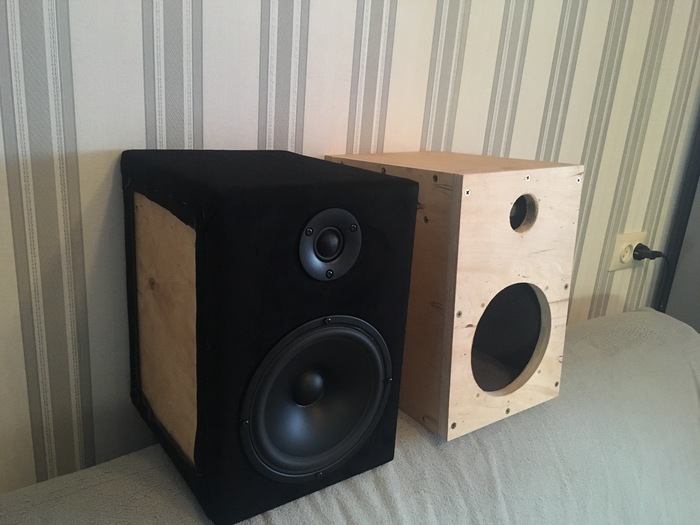 И вот тут появилось вдохновение и прекраснейшая идея: "а почему бы колонки с черными динамиками не закатать в черную алькантару!". На следующее утро приполз в южный порт, забрал заказанную днем ранее китайскую алькантару с коротким ворсом на поролоне и поехал обивать. Алькантарой обивались передняя и задняя стенки, а также верх и низ. В общем кольцом. Мебельным степлером по бокам прибивалась к фанере, вокруг отверстий под динамики и терминалы тоже пробивалось скобами, чтобы алькантара не вылеза.