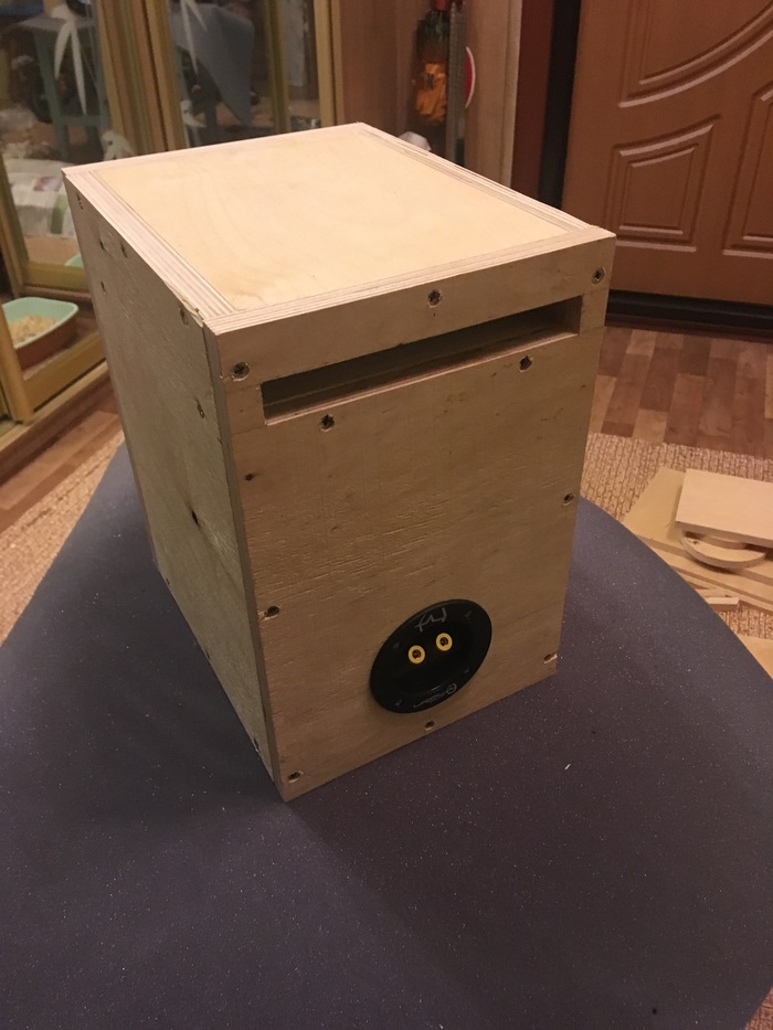 Щель под фазоинвертор и отверстия под терминалы и динамик делал перед сборкой, ибо потом это слишком неудобно и сложно(в этом я все же смог убедиться чуть позже).
