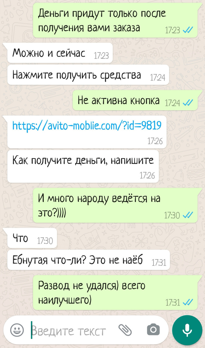 Товарищ настаивал, чтобы я ткнула ссылку на что-то неизвестное, якобы я сразу получу деньги за товар, который я даже не отправила!))) да ну бред какой-то....
