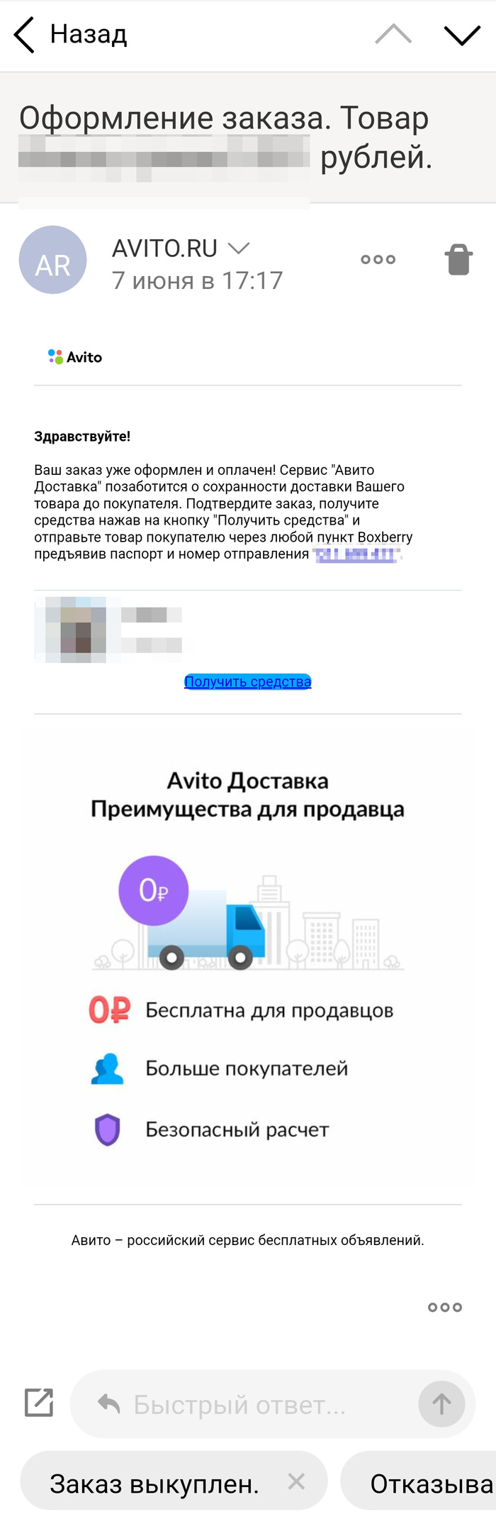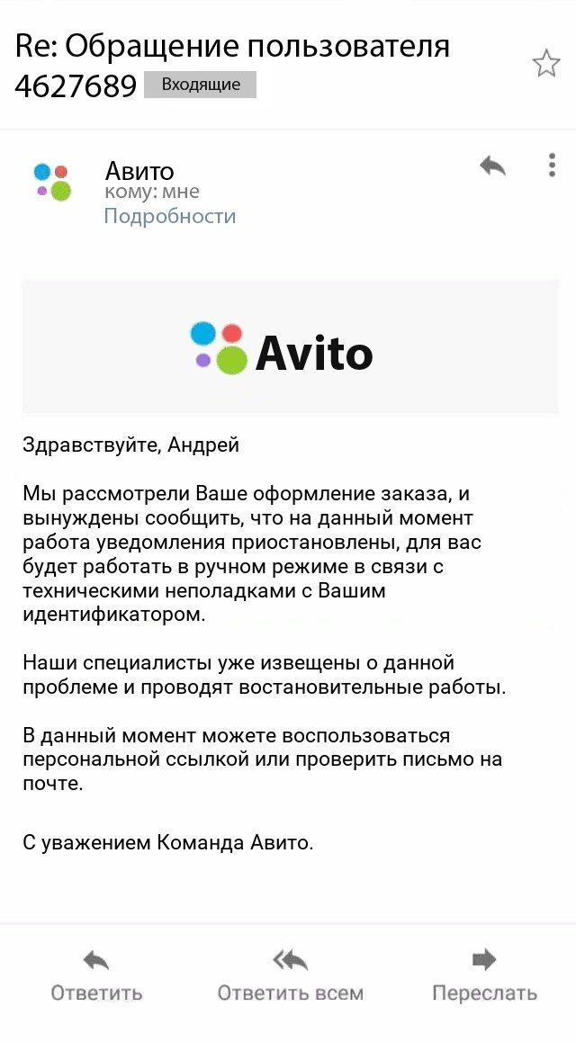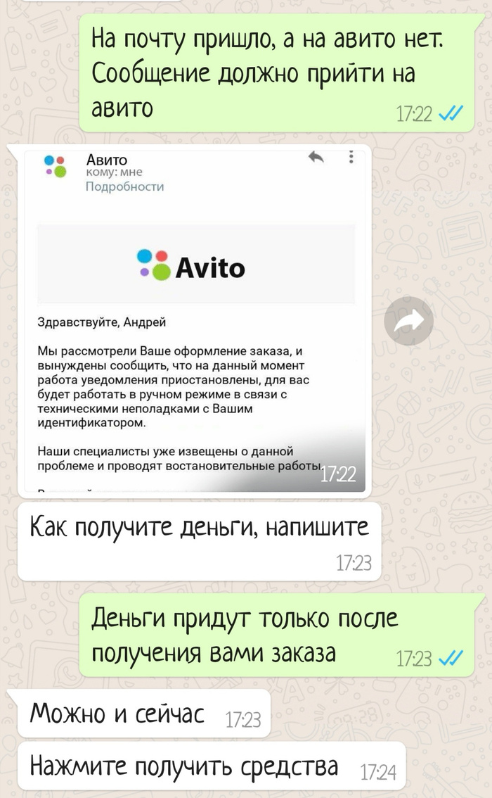 И опа... Он скидывает мне скрин сообщения якобы от тех поддержки Авито, что оформление доставки работает только через электронную почту!!!
