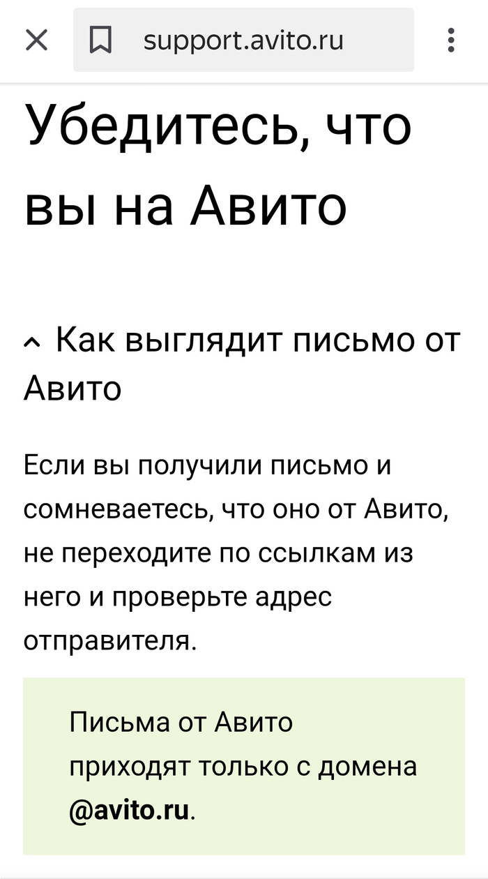 Идём на Авито, где прописаны условия, помощь пользователю и т. д. И находим пункт, что Авито использует только свой домен
