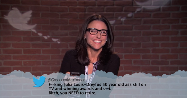 «Джулия, блять, Луис-Дрейфус, пятидесятилетняя задница, все еще на ТВ и награды, блять, выигрывает. Пора на пенсию, коза!»