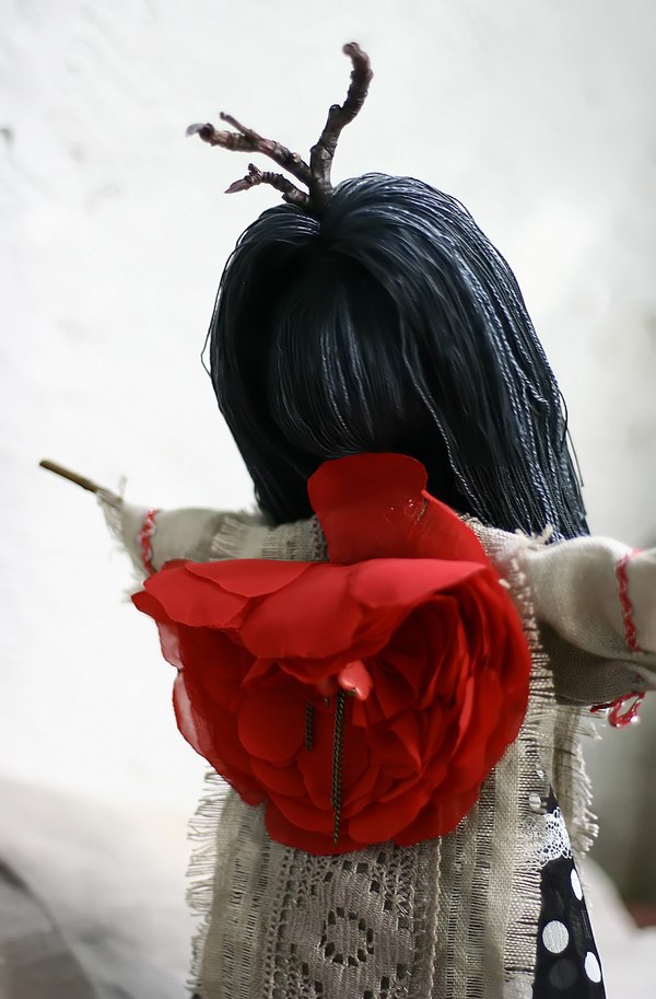 "Помнишь, ты мне куколку делала? Знаешь, она мне очень-очень помогла. Благодарю тебя за нее! Сейчас она у меня истрепалась вся. Только одежду ей поправлю, все снова вылезает! Я её даже стараюсь и не трогать... Куколку так жалко, она такая родная мне и хорошая!! Я её пытаюсь держать в тонусе, но она разваливается по частям!!!! Решила сфотографировать её без прикрас и отправить тебе... Что это может значить? она своё отработала? Кандидат есть... Видимо, пришла пора мне решение принимать??? Кстати, познакомилась я с тем человеком именно тогда, когда ты мне её сделала. И, видимо, сейчас она уже вовсю сигналит?? ... а я думала, может ей другой наряд нужен? А тут уже все серьёзно..."