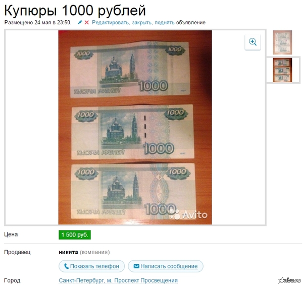 428 hamster777 10 лет назад Просто бизнес Просто банкноту в 1000 рублей продает за 1500 рублей. Народ зарабатывает как может Авито Объявление Деньги