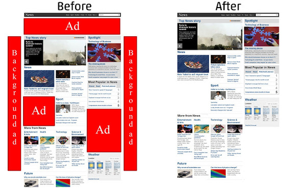 От рекламы в фоне сайта поможет применение userstyles. Для этого необходимо установить расширение Stylish (Chrome, Firefox) и сами стили, которые могут быть как локальными (для одного сайта), так и глобальными. Большую часть рекламы из бэкграунда сайтов поможет убрать RU AdList CSS Fixes, также разработанный создателями RuAdlist. Проверить работоспособность можно на Кинопоиске. Там же, на userstyles.org, можно поискать стили для конкретных сайтов, а если чуть-чуть разобраться в основах HTML/CSS, то и писать их самому - зачастую для "исправления" сайта нужно написать всего одну-две строчки кода. В качестве примера тривиального стиля приведу пару своих: для удаления банера в фоне redkassa.ru и исправления размера сетевизора на echo.msk.ru.