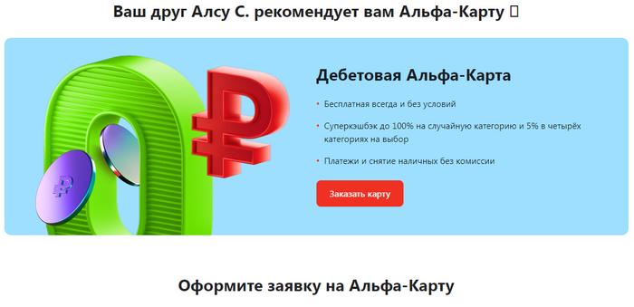 Примечательно что ссылка введет на некую Алсу С., которая по рефералке получит за оформленную мной карту вознаграждение до 1500 р. И неизвестно сколько доверчивых граждан окучивают эти товарищи, но если номер +79263425250 вбить в поисковике видно, как усердно они раскидывают свое "заманчивое" предложение по всевозможным пабликам в разных городах РФ.