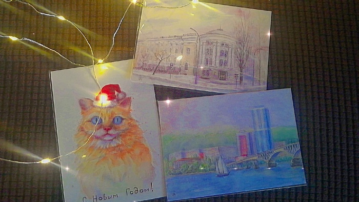 три очень красивые открытки, на одной из которых написано пожелание от Тайного Деда Мороза)