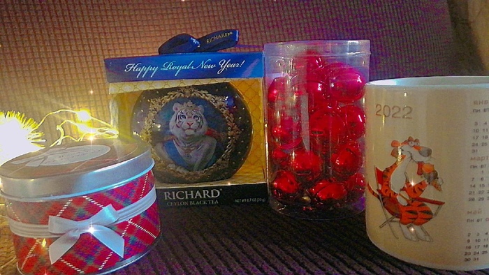 Слева направо: свечка, ёлочная игрушка с чаем внутри(очень красивая), бубенцы и кружка с календарем. бубенцы услышала сразу как забрала посылку с почты. Иду, а внутри что-то звенит - так и веет новогодней атмосферой.