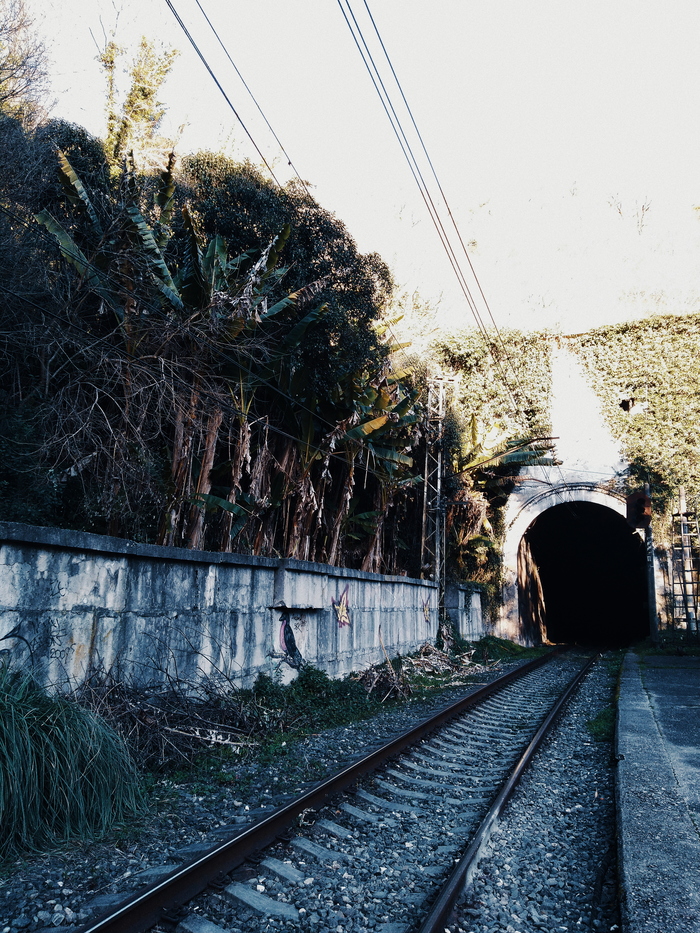 Наш путь лежал к заброшенной жд станции Псырцха. Как выяснилось на месте, она не сильно-то и заброшена, поскольку движение через эту станцию осуществляется. Поэтому надо быть внимательными, если вы хотите сделать красивую фотографию около путей.