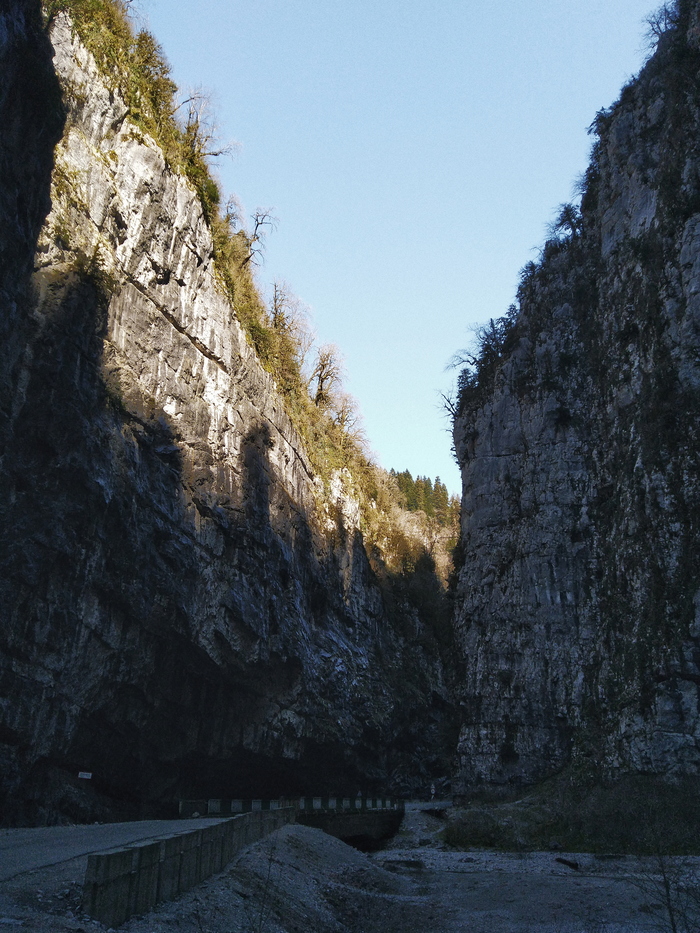Пройдя вырубленный тоннель, в котором установлена икона (к сожалению, забыла сфотографировать, но её можно легко найти в интернете), развернувшись на него лицом, можно увидеть в скале попытки прорубить дорогу над рекой. Но видимо решили, что эта работа слишком опасна из-за отвесного уклона, поэтому прорубили тоннель.