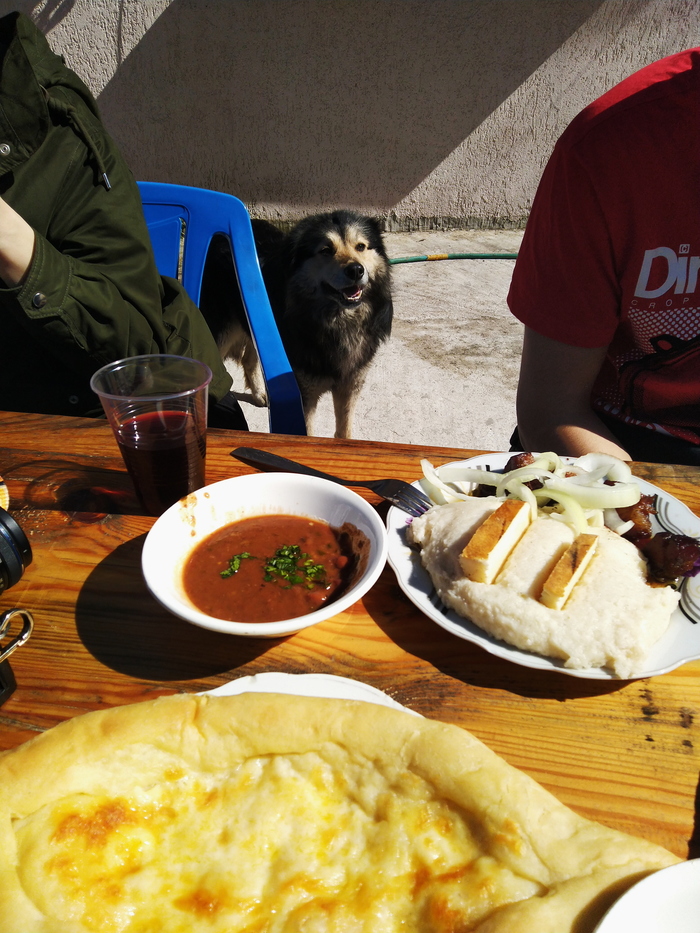 На фотографии ниже можно увидеть наш замечательный обед (со своими напитками, конечно же) всего лишь за 350 рублей на одного. Очень вкусно и сытно! Да ещё и с прекрасным видом на озеро и в компании доброй собачки Мухи.