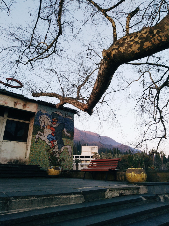 Первое, что привлекло наше внимание - это заброшенный в 1992-1993 гг Зимний театр, расположенный на проспекте Ардзинба (Гагра), напротив остановки "Колоннада".