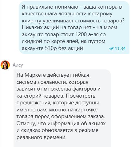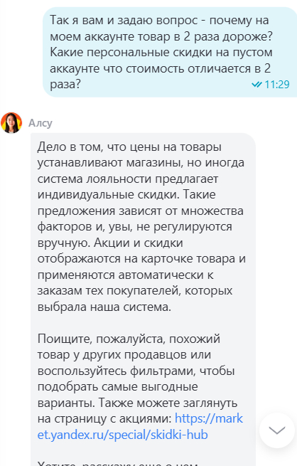 Когда я, потрясенные такой ценовой дискриминацией, обратились в поддержку Яндекс.Маркета за объяснениями, нам прислали шедевр корпоративного лицемерия и пустословия: