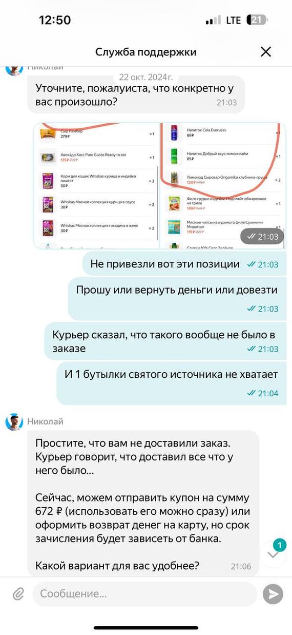 Приезжает курьер с подозрительно маленьким количеством пакетов, о чем я ему и говорю. Он пожимает плечами и удаляется. Осмотрев все, что мне привезли - замечаю, что не хватает как раз таки ВСЕЙ ГАЗИРОВКИ и КОШАЧЬЕГО НАПОЛНИТЕЛЯ. Перезваниваю курьеру, вопрошаю, не забыл ли он может все таки пакет в машине? Все бывает, все мы люди. На что получаю отрицательный ответ и предложение обратиться в поддержку яндекса. Не вопрос. Я частенько пишу в тех.поддержки - иногда товар просрочен, иногда хочу благодарность выразить.