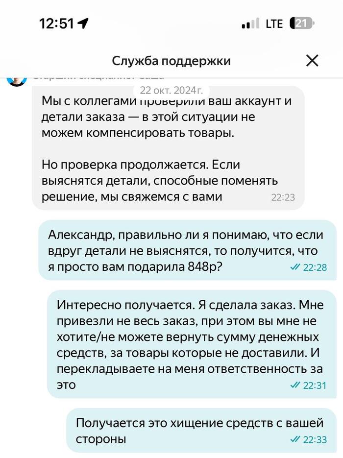 Я чувствую, что легче "отпустить и забыть" и просто не пользоваться данным сервисом впредь, но мне обидно, что в аналогичной ситуации с самокатом (здоровья ему), на общение с тп и ожидание курьера с довозом ушло не больше часа, ЧАСА КАРЛ. Лавка же с 22 числа меня кормит только - мы не можем предоставить бОльшую компенсацию. Я не стала прикладывать все скрины, где меня посылают, я думаю и так понятно, но если надо - без проблем.