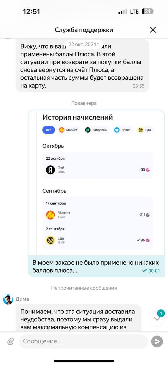 Яндекс со своей стороны изображает бурную деятельность, проверяет мой аккаунт, находит списание баллами, которых не было, но тут же дальше опять кормит меня шаблоном.