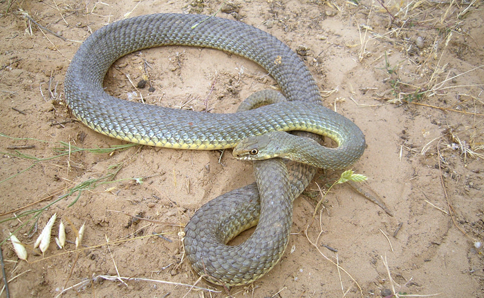 Каспийский ( или желтобрюхий) полоз (Dolichophis caspius). Является одной из самых агрессивных змей Европы. В случае опасности, в том числе и при встрече с человеком, он не пытается скрыться, а принимает угрожающую позу и совершает длинные броски с открытой пастью и с громким шипением. При этом, змея стремится укусить его в лицо. Укусы болезненные, но совершенно безопасны для человека.