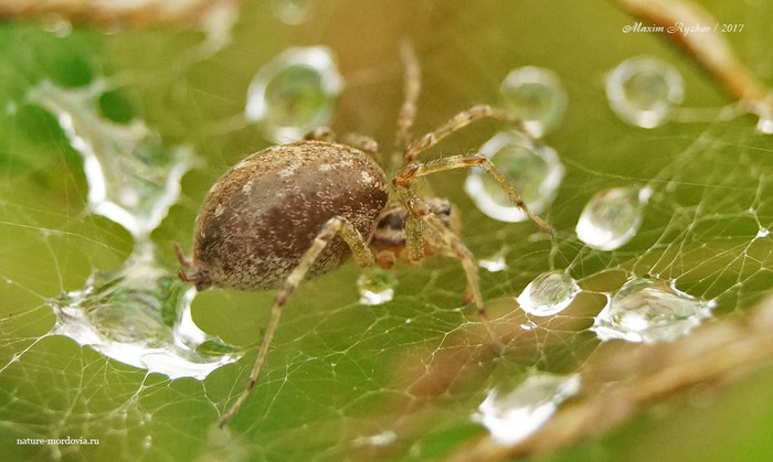 Самки стабильно сидели на полотне паутины, а вот самец бегал по земле. С чем это связано - не знаю. Но, в литературе пишут, что у пауков этого семейства сеть плетут как самцы, так и самки. Хотя, как известно, у других теневиков самцы как правило не плетут паутину.
